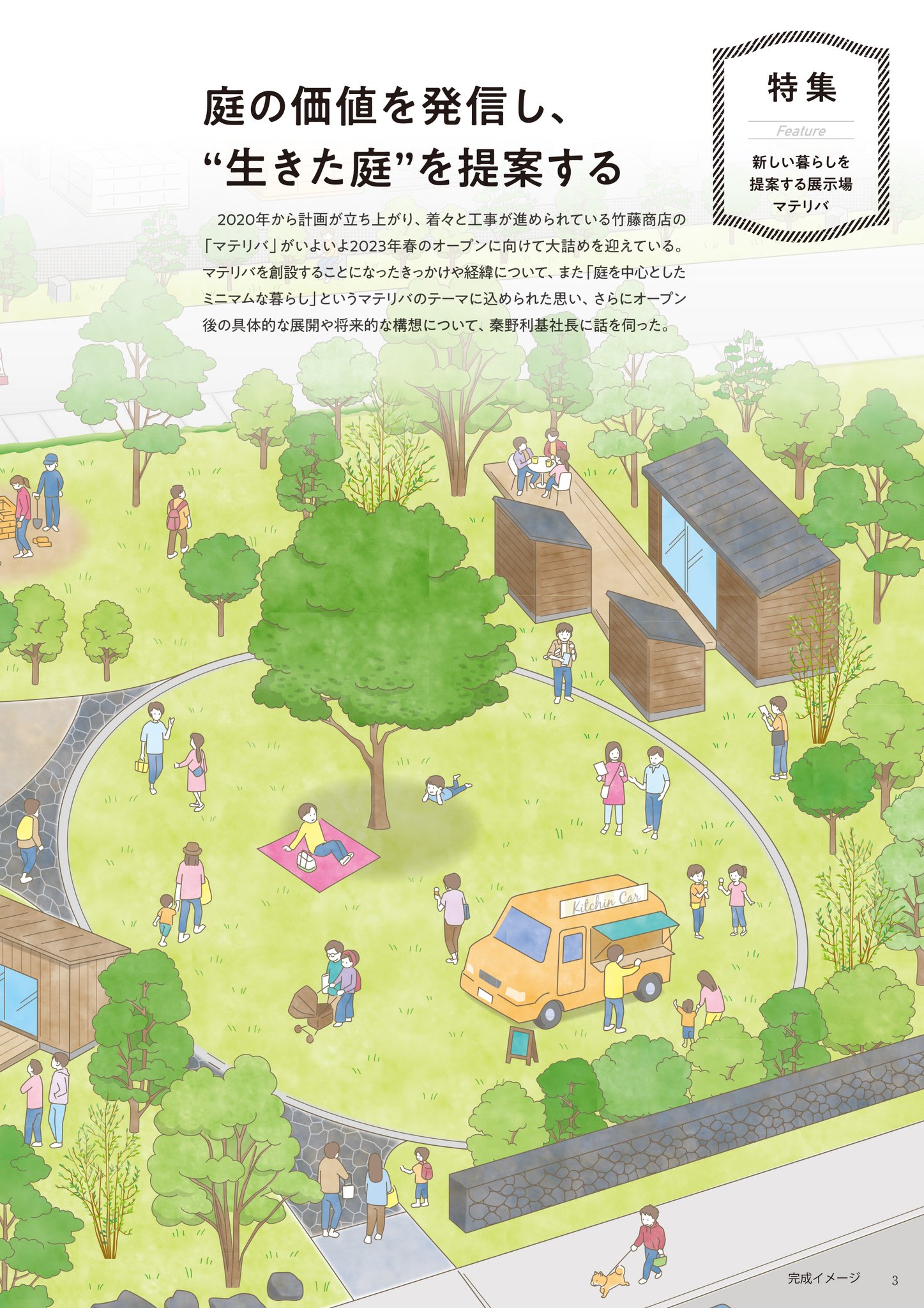 マテリバを創設することになったきっかけや経緯について、また「庭を中心としたミニマムな暮らし」というマテリバのテーマに込められた弊社長の思い、さらにオープン後の具体的な展開や将来的な構想についてが特集されております。